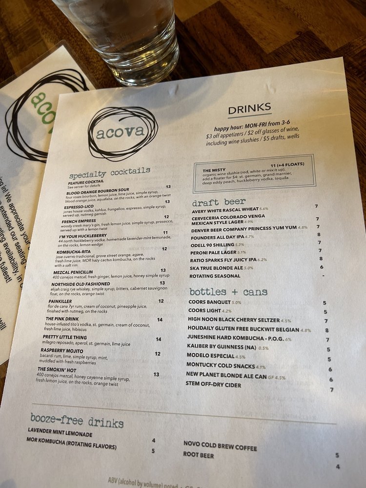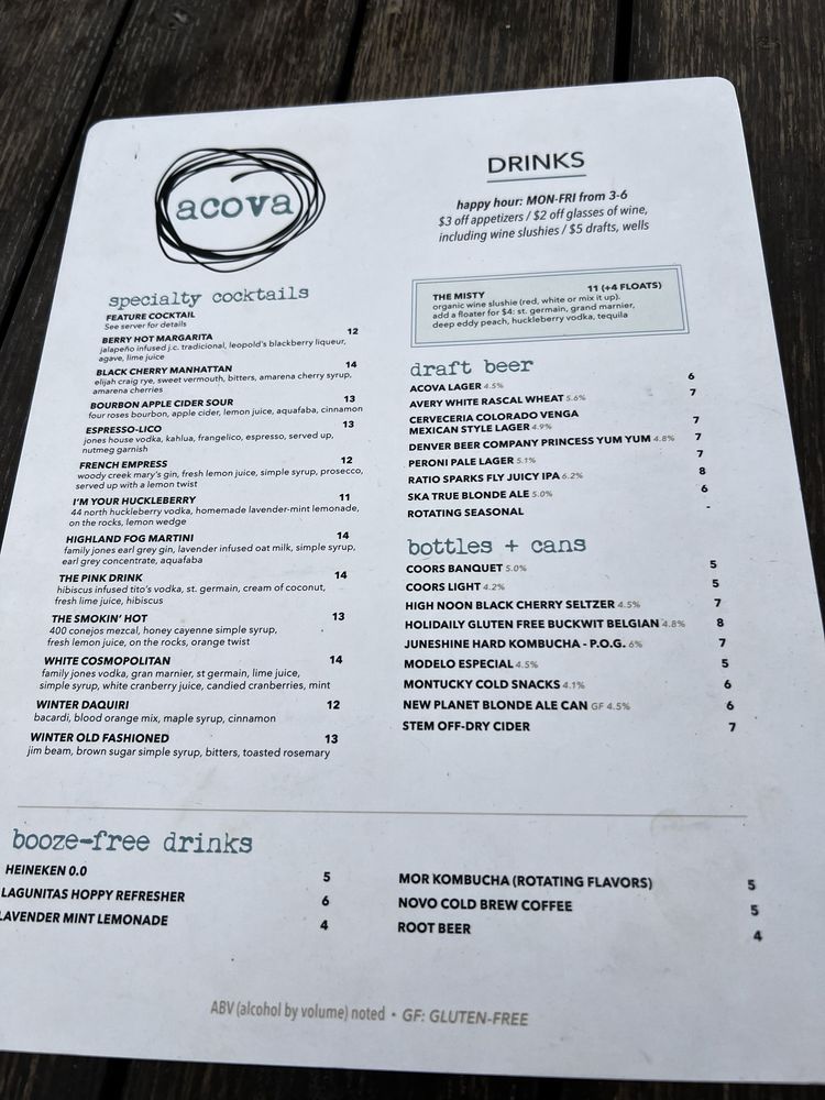 Introducing Acova, a versatile New American restaurant in Denver, CO, known for its gluten-free options, trendy atmosphere, and extensive cocktail bar. Acova offers a diverse menu catering to various dietary preferences, including Pescatarian, Vegan, and Vegetarian options. The restaurant is wheelchair accessible, offers outdoor seating, and provides amenities like free Wi-Fi and QR code menus.